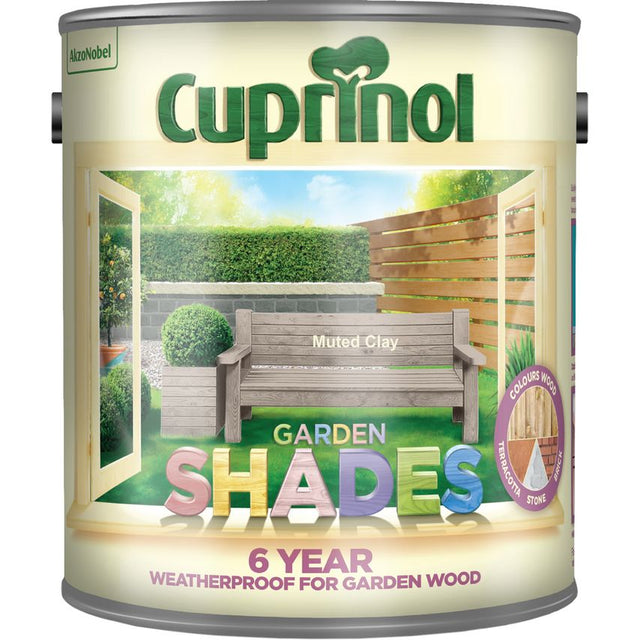 Cuprinol Garden Shades has the following specifications: Colour: Muted Clay.Size: 2.5 litre.