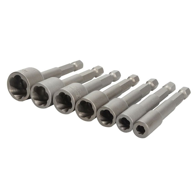 This set of 7 Irwin Power Grip Screw Extractors have reverse spiral flutes for maximum gripping power. The universal shape fits metric and fraction sizes. Featuring a 1/4in hexagon shank suitable for use with power drills and nut drivers, they will easily extract rounded off rusted tight and painted over bolts. They are made from durable high carbon steel for a longer life. Supplied in a durable plastic case. Specifications: Sizes: 8mm, 10mm, 11mm, 3/16in, 1/4in, 5/16in, 3/8in, 7/16in, 1/2in. Drive Size: 1/4in.