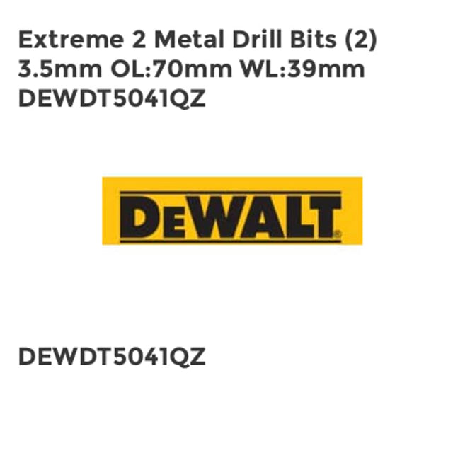 The DEWALT Extreme 2 Metal Drill Bit is suitable for portable or stationary drilling of steel, alloyed and non-alloyed, up to 900N/mm. Particularly suited to drilling sheet or thin materials where accurate burr-free holes are required. Very effective in wood and plastic materials. The patented split pilot point design eliminates walking/slipping on contact.