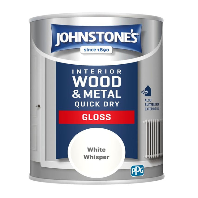 Johnstone's Quick Dry Gloss 750ml White Whisper Johnstones Quick Dry Gloss is a high opacity gloss paint for interior and exterior wood and metal surfaces, including skirting boards, doors, radiators and staircases. Low odour, water based formulation. Dry time: 1-2 hours Coverage: 8m2 (per tin) .