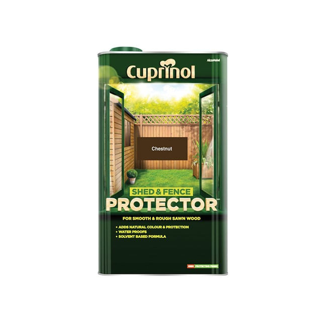 Cuprinol Shed & Fence Protector is a lightly tinted, solvent-based formulation that penetrates deep into the wood to give natural, rustic looking colour to both rough sawn and smooth planed timber. It also contains water repellents to help resist rain penetration. CUPSFCH5L Shed & Fence Protector has the following specifications Colour Chestnut Size 5 litres.