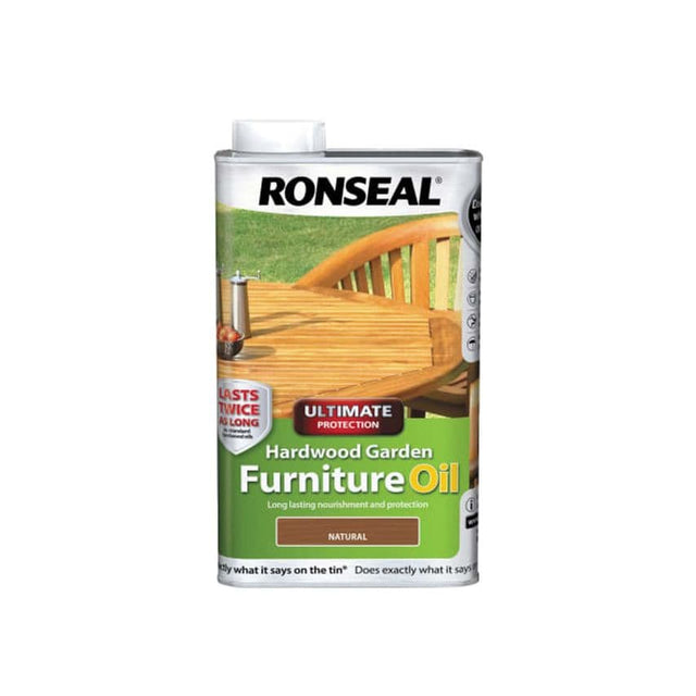 Ronseal Hardwood Garden Furniture Oil penetrates the wood to revive colour and replaces the natural oils lost through weathering, making it look like new. It nourishes the wood from the inside out and has a rapid dry time of 2 hours meaning your garden furniture is back in use in no time. Our Hardwood Oil keeps your garden furniture looking great and youll only have to use it once a year. How To Use: First, give the tin a good shake, pour plenty of oil onto your cloth and wipe the oil onto your furniture, making sure you rub it in well, wipe off any excess. To get the best protection use 3 coats, leaving 4 hours between coats. If you get any oil on yourself, wash it off with warm, soapy water. Over time youll see the colour fade, for the best protection itll probably need doing every 12 months. Cleaning Up: Wash your cloths in warm, soapy water before throwing them away. Dont pour any left over oil down the drain or into watercourses. Your local authority may have special ways to get rid of unused products. Coverage: 18m per litre. Dry Time: Rainproof in 2 hours, 4 hours between coats.