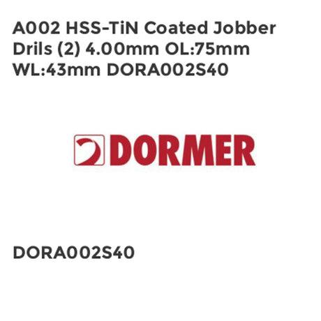 Low stock (10 units)£12.53Unit price /UnavailableA002 HSS-TiN Coated Jobber Drils (2) 4.00mm OL75mm WL43mm DORA002S40