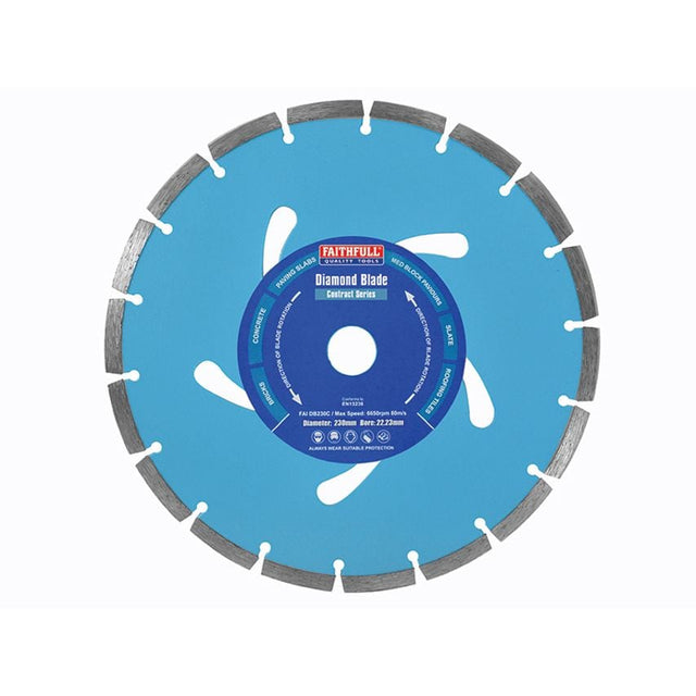 This Faithfull Contract Diamond Blade has 7mm sintered, diamond impregnated segments. Suitable for wet and dry cutting, and ideal for general cutting applications such as tiles, paving slabs, breeze blocks and brickwork. Manufactured to EN 13236 Standards.