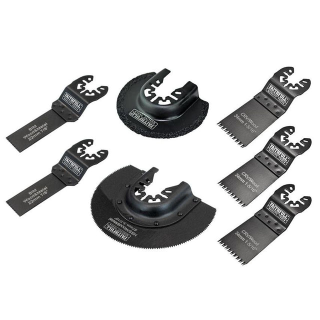 This 7 piece Faithfull Multi-Function Tool Blade Set contains a selection of the most popular blades for cutting wood, man-made boards and metal and removing grout. Compatible with many multi-function oscillating power tools. The set comprises of 3 x Multi-Function Tool CrV Flush Cut Wood Blades Side Set, 2 x 34mm and 68mm. This fast-cutting saw blade has a broad range of applications with ground, side set hardened teeth. Quick cutting performance in softwood, plastics, plasterboard, plastic pipes and similar materials. 2 x Multi-Function Tool Bi-Metal Flush Cut Wood/Metal Blade 22mm. The HSS wavy set teeth on this bi-metal blade make it ideal for sawing wood, copper and aluminium pipes, sheet metal, plastics and profiles. Ideal for many flush cutting applications and plunge cutting in plasterboard. 1 x Multi-Function Tool Bi-Metal Radial Blade Wood/Metal 87mm. The HSS wavy set teeth on this bi-metal blade make it ideal for sawing wood, copper and aluminium pipes, sheet metal, plastics and profiles. Ideal for cutting veneered and laminated boards as well as parquet in flooring and partition wall applications. 1 x Multi-Function Tool Radial Carbide Grit Blade 65mm. Ideal for a broad range of applications with carbide grit edge. Cuts tiles, plaster, porous concrete and similar construction materials. Suitable for cutting out damaged tile joint and for cutting grooves in plaster, porous concrete and similar construction materials.