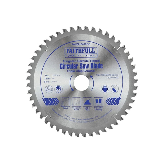 Faithfull Professional Triple Chip Ground TCT Circular Saw Blade with 7mm Tungsten Carbide Tipped teeth to ensure a long working life and accuracy of cut. Each blade has laser cut expansion slots to improve their performance by reducing heat build up. Negative rake blade (NEG) is advisable when the blade is taken to the workpiece. This blade has triple angle ground teeth and negative rake for use with Mitre Saws and Radial Arm Saws when cutting laminates and aluminium.