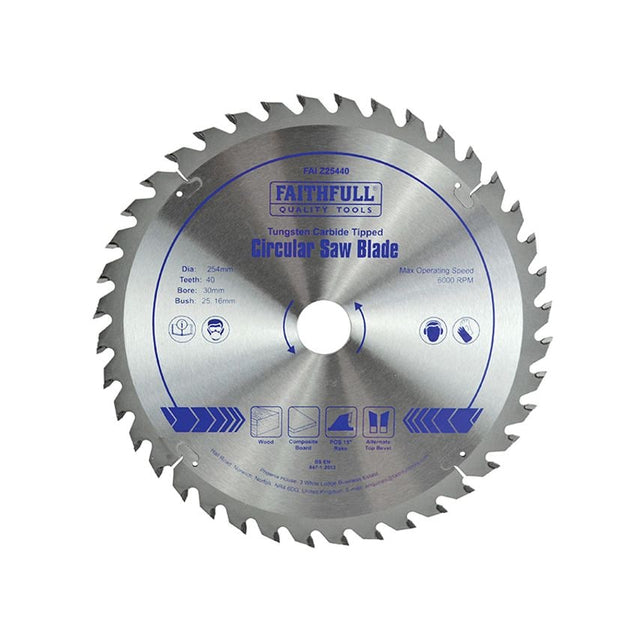 Faithfull Professional TCT Circular Saw Blade with 7mm Tungsten Carbide Tipped teeth to ensure a long working life and accuracy of cut. Each blade has laser cut expansion slots to improve their performance by reducing heat build up. Available in a variety of sizes with different tooth counts that allow the user to select the correct blade for the job in hand. All the blades in this range fit most popular makes of power machines.