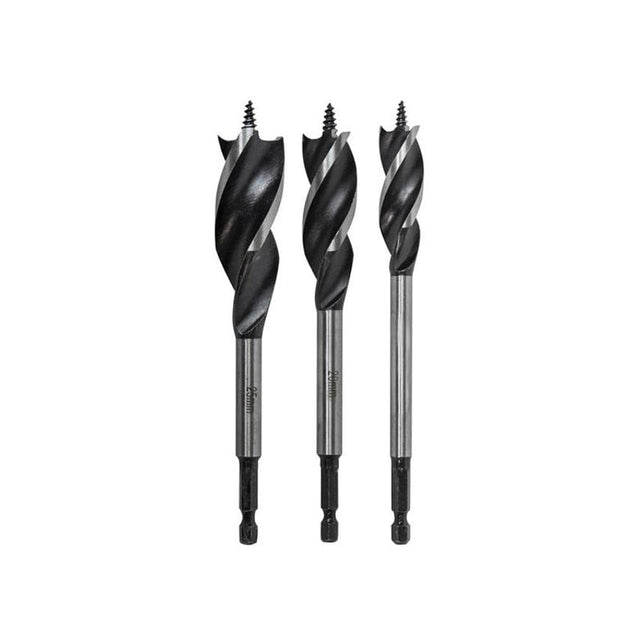 Faithfull Tri-Point Speed Auger Bits will drill fast and clean holes in all types of wood. The three spurs and cutting edges create perfectly round holes with less chance of binding in the workpiece. Three flutes offer efficient waste removal making them much faster than traditional bits. A self-feeding screw tip enables accurate centring and pulls the bit through the wood. Precision machined from high-quality carbon steel with ground and honed cutting edges. The quick-release 1/4in hex shank is impact rated for use in impact drivers as well as all other corded and cordless drills. Specification: Overall Length: 159mm