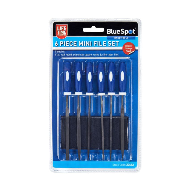 The Blue Spot Tools 6 Piece Mini File Set With Pouch features six mini files ideal for hobby and detailed work in tight areas. Features soft grip handles for increased comfort. Includes handy carrying pouch for quick and convenient storage.