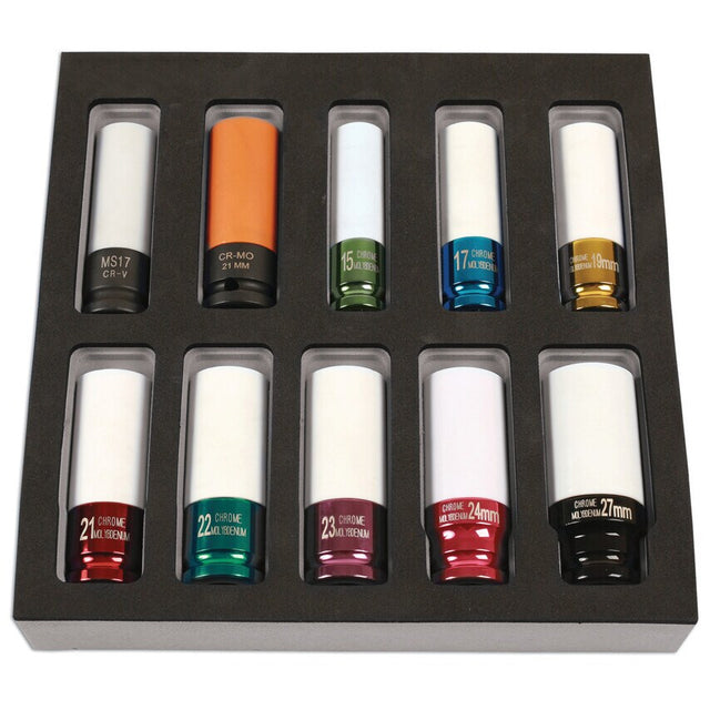A 10-piece thin wall socket set for nuts on alloy wheels. Eight of the sockets have a single hex profile; one has a WAF profile for Mercedes and one has a special profile (similar to WAF) as used on some Hyundai models. Features and Benefits All the sockets come with a protective nylon sleeve to help stop damage to alloy wheels Master set from 15mm to 27mm covering all popular wheel nut sizes to suit your needs Manufactured from Chrome Molybdenum (except socket MS17, manufactured from Chrome Vanadium) for durability Typical Applications Ideal for use on vehicles such as Mercedes and some Hyundai models Warnings Do not use impact tools