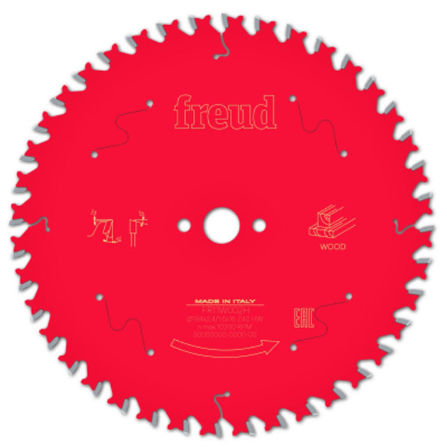 Freud F03FS09704 Circular Saw Blade for Wood 184mm x 16mm x 40T (FR11W002H) The Freud F03FS09704 is a 184mm Circular Saw with a Perma Shield coated blade suited to cordless portable machines. Perma Shield gives new life to underpowered saws and produces smooth crosscuts in hardwoods, softwoods and moldings. Coated blades pull 1/3 less on the saw, which translates into 33% more cutting power. Thin kerf blades remove less material than standard carbide blades, thus requiring less horsepower to produce equally good results. Features: Reduction of vibration - specially designed anti-vibration slots enable smooth running and minimise noise Maximum durability - Freud tri-metal shock resistant brazing alloy consists of copper wrapped between silver layers to withstand extreme impact Long lifetime - Customised teeth made of extra durable and hard carbide grains from in-house development and production Reduction of friction and prevention of corrosion - this innovative coating technology provides superior protection and guarantees durable cutting performance Clear user guidance - application material laser marked on each blade for easy and immediate user recognition Precision cutting - the premium steel body (up to HRC46) guaranteed precision and high endurance Highest blade stability and accuracy - thanks to expansion slots in the special rolled in tension ring Specification: Diameter: 184mm Bore Size: 16mm Teeth: 40 Kerf Thickness: 2.4mm