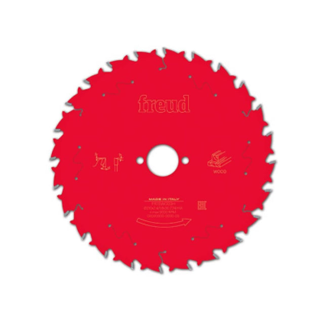 Saw blade for processing wood and wood-based materials Ideal for processing hard wood, soft wood and wood materials with plunge and hand circular saws. Optimally suited for cutting along the wood fibre. Features: Ideal for processing wood and wood-based materials with plunge and hand circular saws. The titanium-cobalt-carbide alloys (TiCo) specially produced by Freud enable flawless results with enormous tool life. The PermaShield coating provides durable protection and reduces build-up. Ideal for rip cutsting, good for cutting querto wood fibre. Saw blades from Freud - the world's largest manufacturer of high quality circular saw blades. Lasered anti-vibration slots guarantee smooth running and minimize noise. The special brazed joint (Freud Tri-Metal) consists of a layer of copper between two layers of silver, which ensures improved stability during hard impacts. Highest precision in production: each saw blade is individually balanced. The ring-shaped imprint in the main blade bears witness to this complex pre-tensioning process. Laser-cut expansion slots guarantee a clean concentricity. Steel blade of selected steel guarantees precision and longevity. Technical data: Freud classification: Cabled | hand-guided | wood ( lasered onto the saw blade as a pictogram) Saw blade : 210 mm Cutting width: 2.4 mm Blade thickness: 1.8 mm Bore : 30 mm Number of teeth: 24 Tooth form: Alternating tooth Angle of rake: 15 Pin holes: 2/7/42