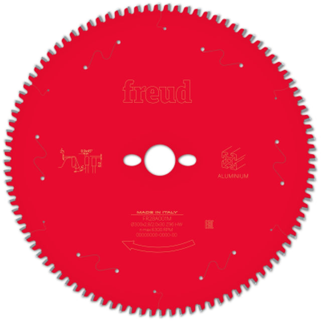 Saw blade for processing aluminium and other non-ferrous metals and plastics Ideal for processing non-ferrous metals such as aluminium, copper and brass or plastics with cross-cut and mitre saws. Features: Ideal for processing non-ferrous metals such as aluminium, copper and brass and plastics with cross-cut and mitre saws. The titanium-cobalt-carbide alloys (TiCo) specially produced by Freud enable flawless results with enormous tool life. The PermaShield coating provides durable protection and reduces build-up. Saw blades from Freud - the world's largest manufacturer of high quality circular saw blades. Lasered anti-vibration slots guarantee smooth running and minimize noise. The special brazed joint (Freud Tri-Metal) consists of a layer of copper between two layers of silver, which ensures improved stability during hard impacts. Highest precision during production: each saw blade is balanced individually. The ring-shaped imprint in the main blade bears witness to this complex pretensioning process. Laser-cut expansion slots guarantee a clean concentricity. Steel blade of selected steel guarantees precision and longevity. The essential information is permanently lasered onto each Freud saw blade. Technical data: Freud classification: Cabled | crosscut saw | aluminium ( lasered on the saw blade as a pictogram) Saw blade : 300 mm Cutting width: 2.8 mm Blade thickness: 2.0 mm Bore : 30 mm Number of teeth: 96 Tooth form: trapezoidal flat tooth Angle of rake: -5 Pin holes: 2/7/42 + 2/9/46 + 2/9.5/46.5 + 2/10/60