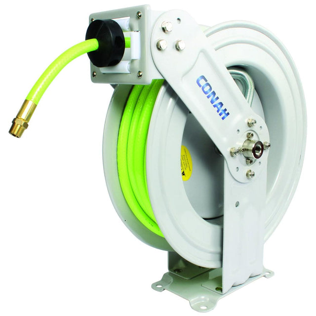 3/8" BSP Tapered Female Inlet x 3/8" BSP Tapered Male Outlet x 3/8" Inside Diameter, Spring Rewind, 3/8", Mountable Steel Air Hose Reel, 15 Metres Length, Hi Vis Polyvinyl Chloride, Maximum Working Pressure 15 bar, FT Pro