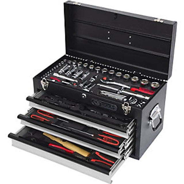 1/4'' + 1/2'' CHROMEplus universal tool set, GEAR, 99 parts, flank traction. Supplied = assembled. Number of parts = 99 pcs. Product type = tool kits. With 3 drawers and an insert at the top. Hexagonal. FlankTraction profile. Bright chrome plated. Chrome-vanadium. All drawers locked and unlocked centrally by opening and closing the cover. Cover locked using cylinder lock. In a sturdy sheet steel tool chest. The following tools are included: 1 x ERGOTORQUE diagonal side cutter, 125 mm 1 x ERGOTORQUE flat nose pliers, 200 mm 1 x ERGOTORQUE combination pliers, 180 mm 1 x locking pliers, 60 mm, 220 mm 1 x water pump pliers, 240 mm, 10'' 1 x fitter's hammer DIN 1041, TV/GS tested 1 x set of ball head hexagon socket keys, XL, 9 pieces 1 x ERGOTORQUEplus straight slot screwdriver, short, 6 mm 1 x ERGOTORQUEplus straight slot screwdriver, 3 mm, 155 mm long 1 x ERGOTORQUEplus straight slot screwdriver, 4 mm, 180 mm long 1 x ERGOTORQUEplus straight slot screwdriver, 5.5 mm, 205 mm long 1 x ERGOTORQUEplus straight slot screwdriver, 6.5 mm, 230 mm long 1 x ERGOTORQUEplus straight slot screwdriver, 8 mm, 265 mm long 1 x ERGOTORQUEplus screwdriver, PH1, 180 mm 1 x ERGOTORQUEplus screwdriver, PH2, 205 mm 1 x ERGOTORQUEplus screwdriver, PH3, 265 mm 1 x ERGOTORQUEplus screwdriver, short, PH2 1 x GEARplus combination ratchet spanner, 8 mm 1 x GEARplus combination ratchet spanner, 9 mm 1 x GEARplus combination ratchet spanner, 10 mm 1 x GEARplus combination ratchet spanner, 11 mm 1 x GEARplus combination ratchet spanner, 12 mm 1 x GEARplus combination ratchet spanner, 13 mm 1 x GEARplus combination ratchet spanner, 14 mm 1 x GEARplus combination ratchet spanner, 15 mm 1 x GEARplus combination ratchet spanner, 16 mm 1 x GEARplus combination ratchet spanner, 17 mm 1 x GEARplus combination ratchet spanner, 18 mm 1 x GEARplus combination ratchet spanner, 19 mm 1 x 1/2'' CHROMEplus extension, 125 mm 1 x 1/2'' CHROMEplus extension, 250 mm 1 x 1/2'' CHROMEplus spark plug socket, 16 mm 1 x 1/2'' CHROMEplus spark plug socket, 21 mm 1 x 1/2'' CHROMEplus in-hex socket, 13 mm 1 x 1/2'' CHROMEplus in-hex socket, 15 mm 1 x 1/2'' CHROMEplus in-hex socket, 17 mm 1 x 1/2'' CHROMEplus in-hex socket, 18 mm 1 x 1/2'' CHROMEplus in-hex socket, 19 mm 1 x 1/2'' CHROMEplus in-hex socket, 20 mm 1 x 1/2'' CHROMEplus in-hex socket, 21 mm 1 x 1/2'' CHROMEplus in-hex socket, 22 mm 1 x 1/2'' CHROMEplus in-hex socket, 24 mm 1 x 1/2'' CHROMEplus in-hex socket, 27 mm 1 x 1/2'' CHROMEplus in-hex socket, 30 mm 1 x 1/2'' CHROMEplus in-hex socket, 32 mm 1 x 1/2'' CHROMEplus in-hex socket, long, 17 mm 1 x 1/2'' CHROMEplus in-hex socket, long, 19 mm 1 x 1/2'' CHROMEplus slide/enlargement adapter, 3/8''F x 1/2''M 1 x 1/2'' CHROMEplus reversible ratchet, 72-tooth, plastic handle 1 x 1/4'' CHROMEplus in-hex socket, 4 mm 1 x 1/4'' CHROMEplus in-hex socket, 5 mm 1 x 1/4'' CHROMEplus in-hex socket, 6 mm 1 x 1/4'' CHROMEplus in-hex socket, 7 mm 1 x 1/4'' CHROMEplus in-hex socket, 8 mm 1 x 1/4'' CHROMEplus in-hex socket, 9 mm 1 x 1/4'' CHROMEplus in-hex socket, 10 mm 1 x 1/4'' CHROMEplus in-hex socket, 11 mm 1 x 1/4'' CHROMEplus in-hex socket, 12 mm 1 x 1/4'' CHROMEplus in-hex socket, 13 mm 1 x 1/4'' CHROMEplus in-hex socket, 14 mm 1 x 1/4'' CHROMEplus in-hex socket, long, 8 mm 1 x 1/4'' CHROMEplus in-hex socket, long, 10 mm 1 x 1/4'' CHROMEplus in-hex socket, long, 13 mm 1 x 1/4'' CHROMEplus square screwdriver, 150 mm 1 x 1/4'' CHROMEplus T-handle with glide, 110 mm 1 x 1/4'' CHROMEplus extension, 50 mm 1 x 1/4'' CHROMEplus in-hex bit socket, 3 mm 1 x 1/4'' CHROMEplus in-hex bit socket, 4 mm 1 x 1/4'' CHROMEplus in-hex bit socket, 5 mm 1 x 1/4'' CHROMEplus in-hex bit socket, 6 mm 1 x 1/4'' CHROMEplus in-hex bit socket, 7 mm 1 x 1/4'' CHROMEplus in-hex bit socket, 8 mm 1 x 1/4'' CHROMEplus bit socket, PH1 1 x 1/4'' CHROMEplus bit socket, PH2 1 x 1/4'' CHROMEplus tamper-resistant Torx bit socket, TB10 1 x 1/4'' CHROMEplus tamper-resistant Torx bit socket, TB15 1 x 1/4'' CHROMEplus tamper-resistant Torx bit socket, TB20 1 x 1/4'' CHROMEplus tamper-resistant Torx bit socket, TB25 1 x 1/4'' CHROMEplus tamper-resistant Torx bit socket, TB27 1 x 1/4'' CHROMEplus tamper-resistant Torx bit socket, TB30 1 x 1/4'' CHROMEplus tamper-resistant Torx bit socket, TB40 1 x 1/4'' CHROMEplus bit socket, PZ1 1 x 1/4'' CHROMEplus bit socket, PZ2 1 x 1/4'' CHROMEplus straight slot bit socket, 4 mm 1 x 1/4'' CHROMEplus straight slot bit socket, 5.5 mm 1 x 1/4'' CHROMEplus reversible ratchet, 72-tooth, plastic handle 1 x 1/4'' CHROMEplus straight slot bit socket, 7 mm 1 x 1/2'' CHROMEplus power ball joint 1 x 1/4'' CHROMEplus power ball joint