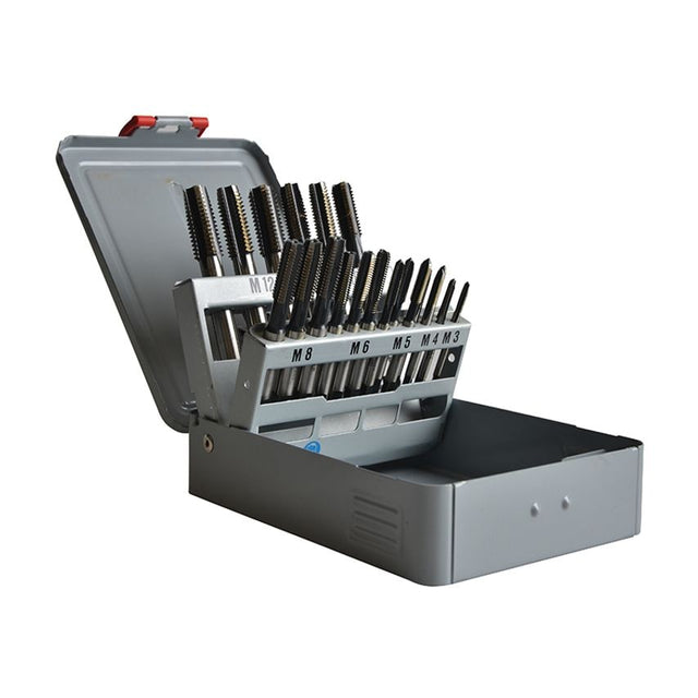 The Halls 21 Piece Tap Kit is supplied in a durable metal tin with metal hinges. Each tap is labelled for easy identification. Containing 3 x of each M3 x 0.5, M4 x 0.7, M5 x 0.8, M6 x 1, M8 x 1.25, M10 x 1.5 and M12 x 1.75.