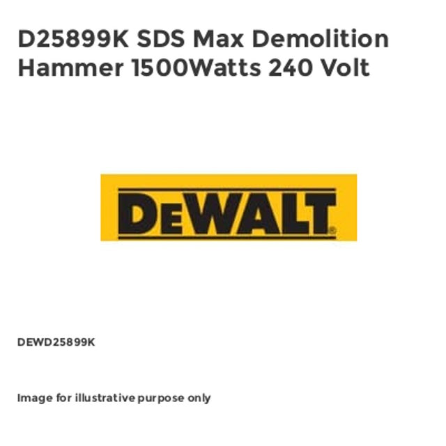 The DEWALT D25899K SDS Max Demolition Hammer (10kg class) is a powerful yet lightweight Breaker with in-line design for better handling and quick-change chisel adjustment for fast orientation of the chisel through 12 preset positions. The large oversize hammer mechanism delivers extreme durability and excellent concrete breaking performance. Its ergonomic inline design ensures user comfort during any application. Whilst its compact, streamlined design allows access in confined areas. In line design for better handling and quick change chisel adjustment allows fast orientation of the chisel through 12 preset positions Modular design allows for quick access to key components allowing for faster and cheaper servicing. 1500 Watt, 95 mm motor delivers outstanding motor efficiency and durability, magnesium housings ensure maximum durability and minimum weight. Multi adjustable side handle can be located anywhere on the hammer barrel, maintaining user comfort in any application. Supplied with: 1 x Multi Position Side Handle and 1 x Heavy-Duty Carrying Case. Specifications: Input Power: 1,500 Watt.Impact Rate: 1,020-2,040/bpm, 17.5 joules.Chuck: SDS Max.Length: 650mm.Height 250mm. Weight 9.6kg.