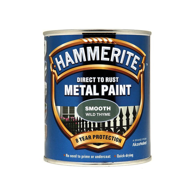 Hammerite Direct To Rust Metal Paint can be painted directly onto rusty surfaces and, thanks to its special 3 in 1 formula, there is no need to use a primer or undercoat - saving you precious time Hammerite forms a superior barrier that not only seals out moisture, but also gives long lasting protection, both inside and outside. Touch dry in an hour, Hammerite is corrosion resistant and is suitable for use on a wide range of exterior metal including gates, railings, drainpipes, guttering and garden furniture. Protects for up to 8 years. This Hammerite Direct to Rust Metal Paint has the following specifications Finish Smooth. Colour Wild Thyme. Size 750ml.