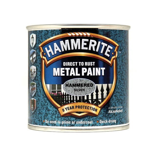 Hammerite Direct To Rust Metal Paint can be painted directly onto rusty surfaces and, thanks to its special 3 in 1 formula, there is no need to use a primer or undercoat - saving you precious time!  Hammerite forms a superior barrier that not only seals out moisture, but also gives long-lasting protection, both inside and outside.  Touch dry in an hour, Hammerite is corrosion resistant and is suitable for use on a wide range of exterior metal including gates, railings, drainpipes, guttering and garden furniture. The paint has a subtle hammered effect with a metallic sheen.  Protects for up to 8 years.