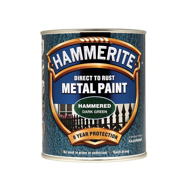 Hammerite Direct To Rust Metal Paint can be painted directly onto rusty surfaces and, thanks to its special 3 in 1 formula, there is no need to use a primer or undercoat - saving you precious time!  Hammerite forms a superior barrier that not only seals out moisture, but also gives long-lasting protection, both inside and outside.  Touch dry in an hour, Hammerite is corrosion resistant and is suitable for use on a wide range of exterior metal including gates, railings, drainpipes, guttering and garden furniture. The paint has a subtle hammered effect with a metallic sheen.  Protects for up to 8 years.
