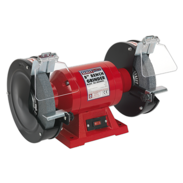 Fitted with copper wound induction motor. Suitable for general workshop grinding and sharpening use. Two aluminous oxide grinding stones, coarse and fine. Fitted with stone guards, adjustable eye shields and spark arrestors. Supplied with 3-pin plug.