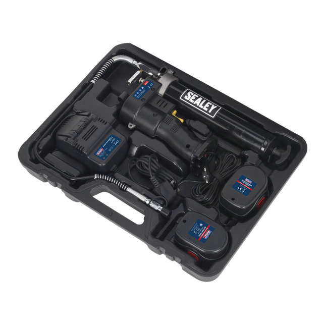 High power, professional, cordless grease gun. Ideal for in-field lubrication where power and speed are required. Suitable for 400g cartridges, manual or bulk filling. Features LCD battery condition indicator, air bleed and heavy-duty aluminium pressure head. Supplied with battery and mains charger in storage case.