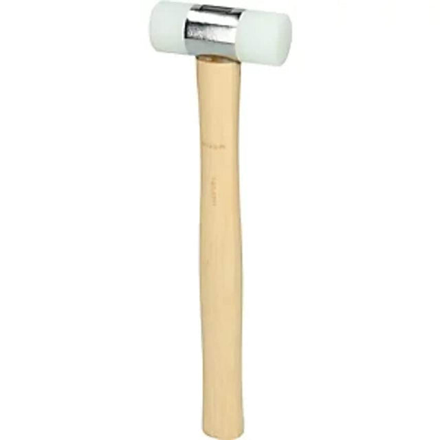 Nylon hammer, ash handle, 200 g. Supplied = assembled. Length = 260 mm. Diameter = 28 mm. Head fastener = tapered collar. Hammer head weight = 200 g. Partial length L2 = 82 mm. Handle type = ash. Weight = 0.23 kg. Product type = nylon hammers. With impact heads made of hardwearing nylon. Shatterproof, does not break and non-wearing. With ash handle. Ideal for hammering out dents and gentle sheet metal work.
