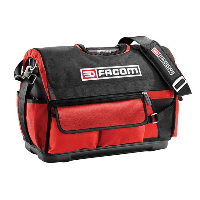 The Facom soft tote bag is constructed from extra tough fabric. It offers maximum tool protection thanks to its rigid and waterproof plastic bottom and reinforced stress points. A heavy-duty steel handle with leather grip makes lifting more secure and comfortable. The open structure makes for quick and easy tool access as it keeps everything in place, and large side pockets provide extra storage. Complete with a clip-on strap for easy carriage. The bag provides handy storage with vertical storage for instant access, an elastic tool holding strap, a side rack, many side pockets and a saw compartment. Storage capacity 47 litres. Weight capacity 15kg. Overall dimensions 51 x 22 x 37cm. Weight 2.797kg.