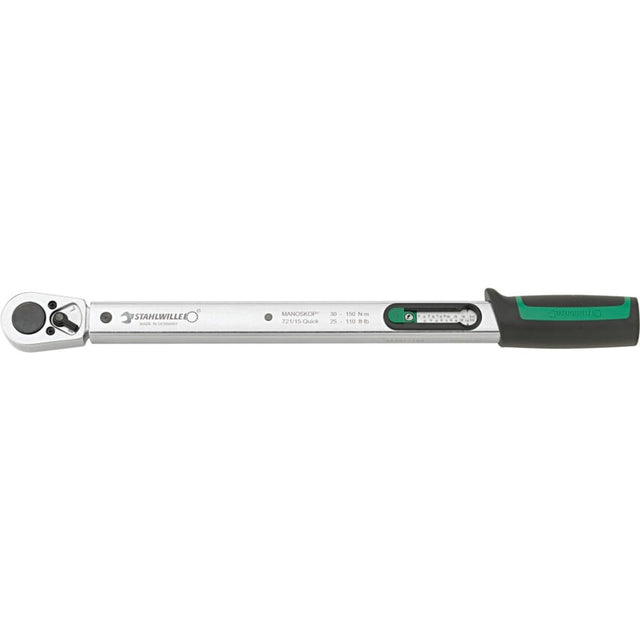 MANOSKOP 721 Quick torque wrench with permanently installed ratchet. Click-type. Fast, accurate setting. Dual stop signal. Easy-to-read double scale Nm/ftlb and ftlb/inlb. The measuring element is only under load while force is being applied, no need to back off to zero after use. Any force applied to the tool after the 'click' or applied in the opposite direction to the current function - e.g. forcible loosening of a jammed screw - does not act on the trigger mechanism and cannot cause damage to it.
