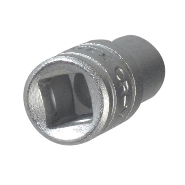A professional matt chromed 1/4in square drive socket, produced in accordance with ISO 9000 and AS954 specifications, for increased torque and reduced risk of rounding fasteners. This hexagonal socket has a relatively short depth and a stepped collar on the shank. Overall Length: 24mm.