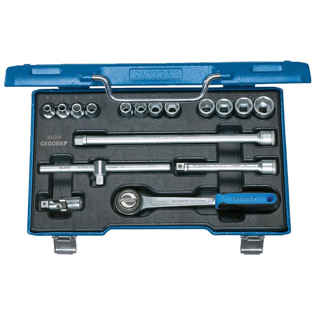 With accessories made from GEDORE vanadium steel 31CrV3 Set U-3 with fine toothed, dial change ratchet In GEDORE blue sheet steel case Dimensions: 320 x 210 x 55 mm Dimensions: 320 x 210 x 55 mm