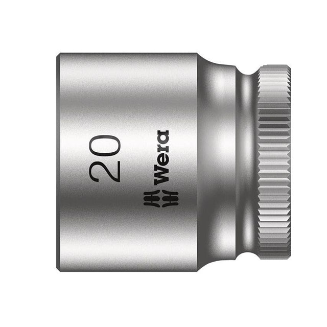 Wera Tools Zyklop HMB 3/8in Drive Metric Production Sockets for hex-head fasteners are suitable for manual and (non-impact) machine applications. Knurling at lower end to enable easy gripping when used in manual applications. Equipped with a ball stop groover. Utilises the Wera Tools 'Take it Easy' tool finder size stamping on the socket and a colour-coded band for rapid and easy identification of the required size. Made from chrome vanadium steel with a matt chrome-plated finish. Manufactured to ISO 2725 Part 3. 1 x Wera Tools Zyklop Socket 3/8in Drive 20mm