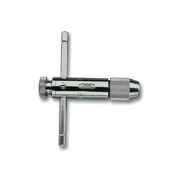 Short ratcheting tap Wrench with two-way ratchet. Features and Benefits Short ratcheting Tap Wrench Two-way ratchet and ratchet lock Polished chromed finish. 25.5mm Diameter M6 Tapping Overall Length 85mm Wrench Type Chuck Typical Applications Suitable for taps up to M6 with 5mm square drive