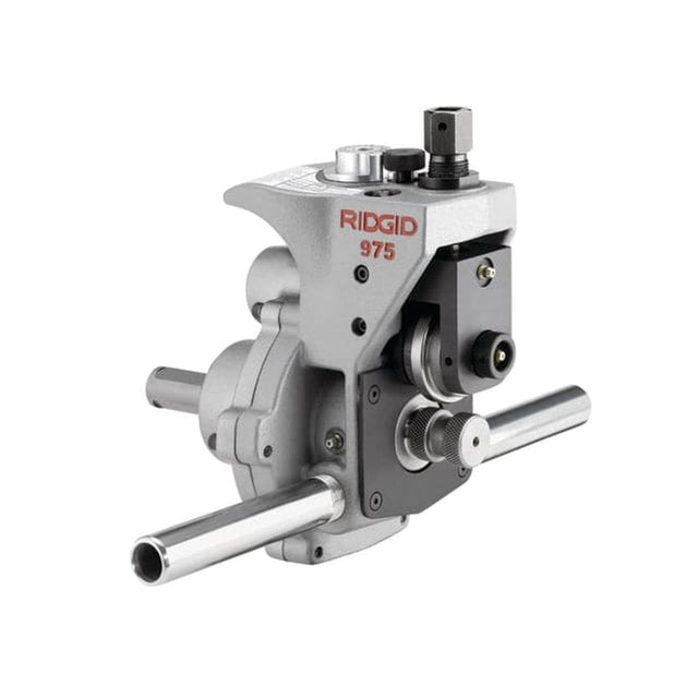 The RIDGID 975 Roll Groover acts as 2 tools in one. It can mount onto the 300 Power Drive for machine powered roll grooving but is also designed to manually roll groove in-place pipe. The 975 Combo Groover includes new, patented auto tracking technology for significantly easier grooving. Whether you're doing machine-powered or manual grooving, the Auto Tracking gauge keeps the pipe automatically engaged to the groover throughout the grooving process. The 975 also includes a permanently depth setting gauge for quicker, repeatable set-up. When manually roll grooving, the 975's 55% higher gear reduction means less hand force required versus competitive manual roll groovers. This is especially helpful for over-head roll grooving. A tough, ductile iron construction means the 975 can absorb jobsite abuse and provide accurate grooves time after time. A cast-in handle makes the 975 easily portable to and from the jobsite. Capacity: 1 in 6in Schedule 10 and Schedule 40 steel, aluminium, and PVC pipe.1 1/4in 6in Schedule 10, 1 1/4in 2in Schedule 40 stainless steel pipe, 11/2in 3in Schedule 80 PVC pipe. With roll change, 2in 8in copper tube .Depth Adjustment: Adjusting screw and integral, index depth gauge.Actuation: Feed screw with 1/2in ratchet wrench , or any 15/16in hex wrench. Power Drive Mounting: RIDGID 300 Power Drive 38/57 RPM .