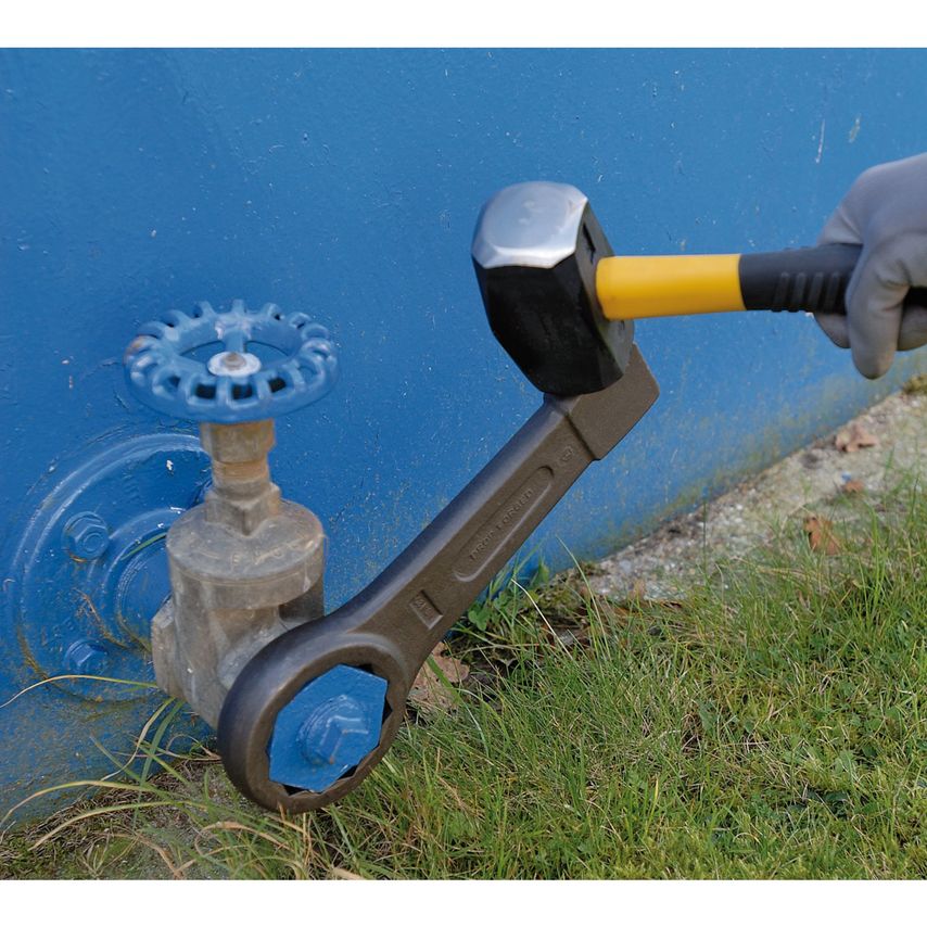 Flat pattern spanners with striking end. Forged from good quality carbon steel, hardened, tempered with black phosphate finish. Length +/- 5mm.