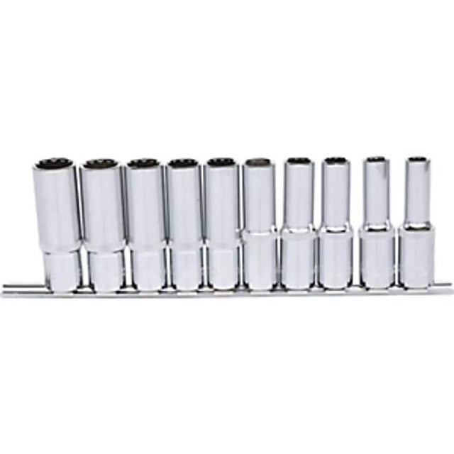 1/2'' CHROMEplus 12 point socket set, long, flank traction, 10 parts. Supplied = pre-assembled, final assembly by customer. Number of parts = 10 pcs. Model = twelve spline. Conforms to = DIN 3120, ISO 1174, DIN 3124, ISO 2725. Weight = 0.74 kg. Square drive = 1/2''. Product type = sockets. Hexagonal. FlankTraction profile. In accordance with DIN 3124/ISO 2725. Square socket in accordance with DIN 3120/ISO 1174 with ball reception. Long model. For manual activities. Bright chrome plated. Chrome-vanadium. Includes storage rail.