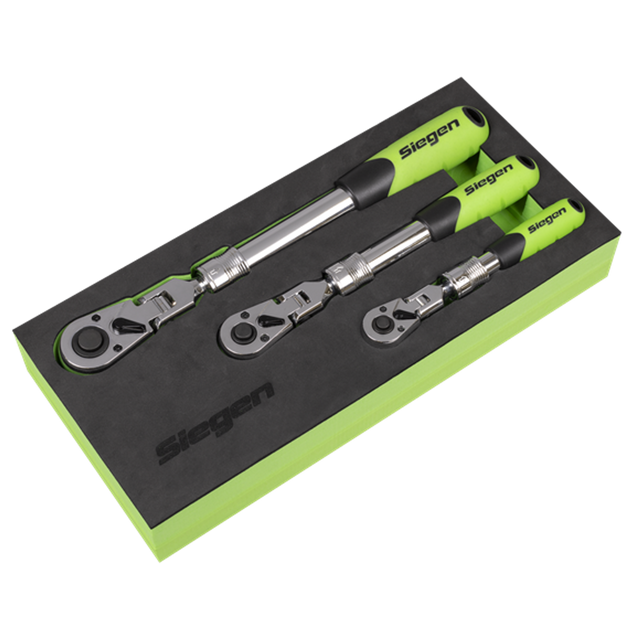 1/4", 3/8" And 1/2"Sq drive Chrome Vanadium steel extendable ratchet wrenches. 72-Tooth ratchet action with flip reverse and quick release mechanism. Hardened and tempered with fully polished mirror finish. Quick release locking ring retains extension at set increments, giving different shaft lengths for increased access in space restricted applications. Soft grip handle for added comfort and control. Supplied in EVA foam storage tray.