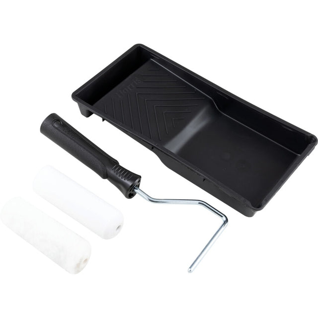 For use with emulsion and gloss paints, this mini paint roller set is comprised of two roller sleeves, a roller frame and a paint tray. Ideally suited for painting on flat, interior woodwork, the sleeves perform best when rubbed with a clean, dry hand before use to remove any dust particles. Do not wet the rollers.