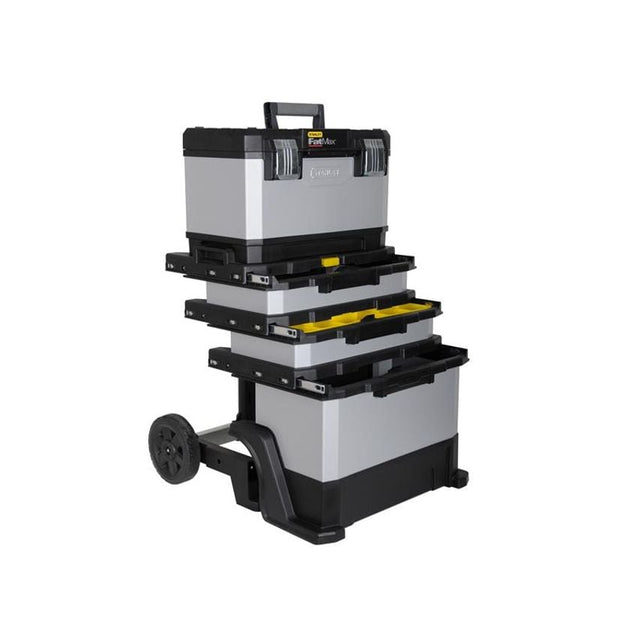 The STANLEY FatMax Metal & Plastic Rolling Workshop has plenty of storage for all your power tools, hand tools, fixings and accessories. Includes a large metal storage bin, two deep sliding drawers, and detachable tool box with removable tote tray. It also features removable organiser cups for small parts and accessories, as well as an integrated V-groove for holding and sawing timbers, pipes and plastic tubing. Complete with large metal rust-proof latches, a telescopic handle and a padlock eye for security. Providing ample portable storage space and ease of transportation with robust road-tested wheels, this storage solution allows you to bring your workshop with you wherever you may be. Specifications: Outer Dimensions: 56.8 x 89.3 x 38.9cm. Max. Load: 50kg. Max. Volume: 71.6 litres.