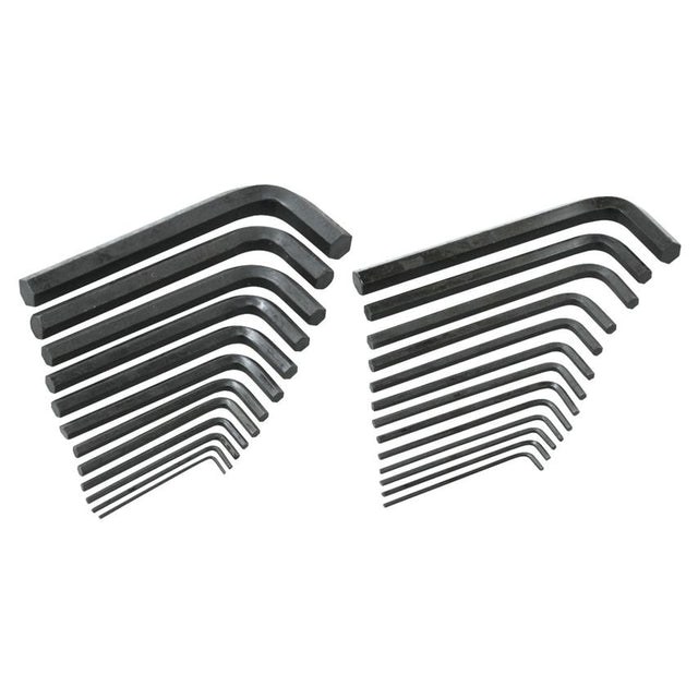 Complete hexagonal key set containing both long arm imperial, and short arm metric keys consisting of long series AF size 3/64", 1/16", 5/64", 3/32", 7/64", 1/8", 9/64", 5/32", 3/16", 7/32", ", ",. Short series metric size 1, 1.5, 2, 2.5, 3, 4, 4.5, 5, 5.5, 6, 7, 8, 10mm. Includes vinyl pouch for storage