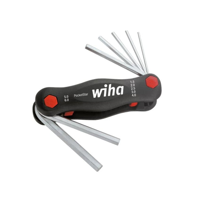 This Wiha PocketStar Hex Key Set has seven hex L-keys made of through hardened, Chrome-vanadium steel with an electro-plated finish. Stored in a handy, space-saving folding holder. The ergonomically shaped housing is made from reinforced fibreglass. An ingenious opening button allows the user to easily select the required key size. Choose your working position, anywhere between 90 and 270, depending on the screw fastening task at hand. In the 180 position, the tool is transformed into a screwdriver, for example. When the key is positioned on the 270 shoulder stop, it becomes a tool with a practical lever arm for high torques. It is also a clever solution for situations where users require just one single key to move in the work position since PocketStar stops the other keys from swinging back and getting in the way. Specification: Sizes: 1.5, 2, 2.5, 3, 4, 5 &6mm.