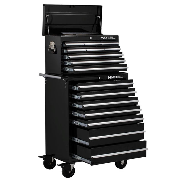 Heavy duty all steel construction with ball bearing slides with positive stop. 5" casters with reinforced cabinet base comes with protective top mat and drawer liners. Keyed locking mechanism full length aluminium drawer pulls, chrome side handles and lockable casters. Consists of: 9 drawer tool chest with 7 drawer extra high rollaway cabinet. Overall dimensions including castors: width 685 x depth 465 x height 1375mm.