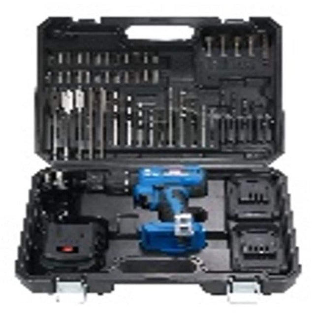 Brushless motor technology delivers improved efficiency, reduced maintenance, reduced heat, and noise. Quick Charger 70min. with 2 x 2.0 Ah batteries and 50 piece accessories suitable for most tasks. 13mm metal keyless locking chuck 3 Functions - Drill, hammer and screwdriver with 25 torque settings and a 2 speed gearbox. Ergonomic design, soft grip handle, belt clip and LED work-light with a wide range of accessories. Specifications: DC 18 Volts, Quick Charger 70 min. with 2 x 2.0 Ah Batteries and power indicator, 50 pce accessories, 13mm metal keyless locking chuck, Forward - Lock - Reverse, Drill, driver & hammer action, 2 speed gearbox, 25 Torque settings, Max Torque: 55 Nm, AC/DC Adaptor, 230V - 50 Hz, No-load Speed 0-500/0-2000 rpm. Impact Rate 0-8000/0-32000 bpm.