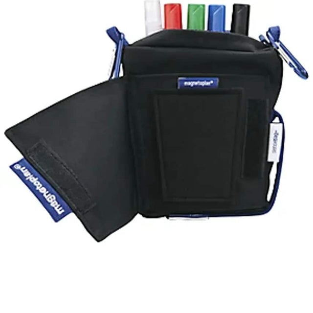 ACTION HOLSTER presentation pouch, equipped with accessories, HxWxD 150 x 190 x 45 mm. Supplied = assembled. Height = 150 mm. Width = 190 mm. Depth = 45 mm. Material = polyester fabric. Feature = magnetic. Colour = black. Product type = presentation pouches. Ideal for everyone who wishes to use their accessories flexibly, easily, in any location, and keep them within reach. Can be attached to the board using magnets, be worn on belt loops or be transported comfortably as a shoulder bag using the carrying strap. The multi-purpose presentation pouch for teachers, trainers, professors, instructors, etc. Developed for working while mobile, e.g. using whiteboards and flipcharts. The pins are lifted out by pulling on the strap, and disappear again inside the bag by pressing on them with an open hand. High quality workmanship and made of black, washable and hardwearing polyester fabric. Contents and features: - 4 board and flip chart marker pens PRO+ (red, blue, green, black) - 1 action cleaner for wet cleaning of whiteboards (10 ml) - 1 washable felt cleaner (hand washable at 30 C) for dry and wet cleaning of whiteboards (incl. clothes protection: a protective flap above the felt cleaner ensures your clothes remain clean) - 2 spring hooks for attachment to belt loops - 1 carrying strap