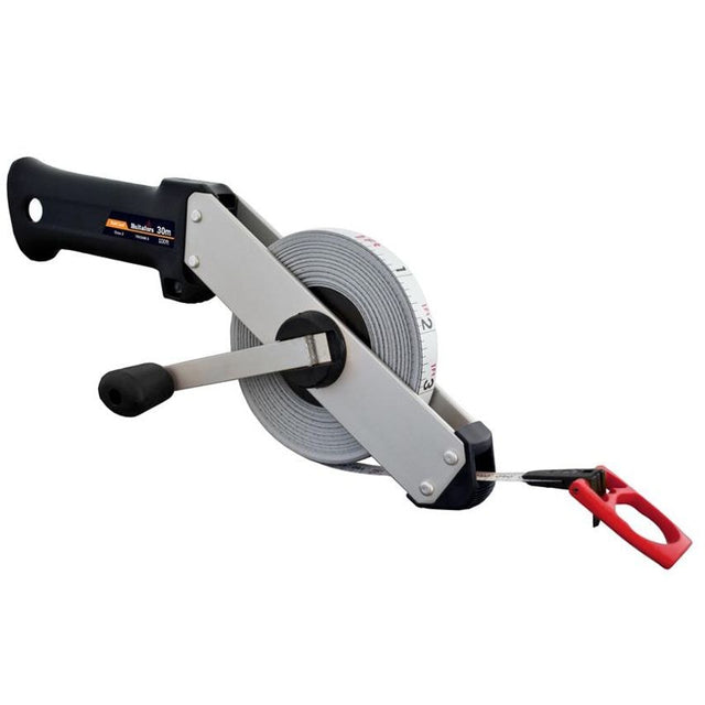 The Hultafors Tracker Tape is ruggedly constructed with an open frame, which allows for any on-site debris to be removed during cleaning. It has a 13mm white & lsquoMatt Coat&rsquo polyester coated steel blade that has both metric and imperial graduations. Corrosion-resistant aluminium frame with an ABS pistol handgrip that offers comfort during use, in particular, when pacing out. The tough, high-impact polymer centre offers additional strength to the winding mechanism. The long winding lever and easy-grip knob make rewinding fast and easy. There is also a corrosion-resistant end-piece. Made in Britain. Specification Blade Length 30m/100ft. Blade Width 13mm. Accuracy EC Class II.