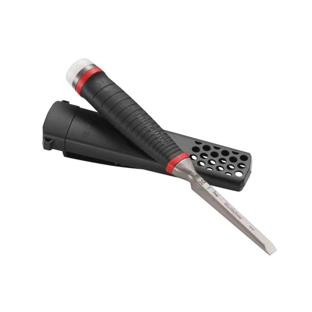 The Hultafors HDC Heavy-Duty Chisels are ideal for tasks requiring strength and precision. Forged in one piece with continuous robust I-profile for extreme breaking strength and to maximize the power transmission down into the workpiece. A 25 cutting edge provides an optimal ratio between sharpness and durability.The entire blade, including the handle, can be placed flat against the surface which allows you to cut parallel to a flat surface. Fitted with a grip-friendly Santoprene handle and impact resistant nylon striker. The striker can be replaced when worn down.Each chisel is supplied in a practical holster. The holster can be attached to both a belt and a button on your work clothes. If your belt is thick, cut away the small pin on the cover.
