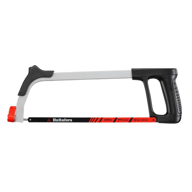 The Hultafors HMS-12 Hacksaw with a steel frame. Its ergonomically shaped handle is made from cast aluminum and complemented with a grip friendly plastic support at the front of the frame to maximize the user friendliness. The blade can be tilted for cutting close to a flat surface without loss of performance and precision. A spring-loaded blade tensioner makes changing blades easy. Supplied with a Hultafors BI-metal blade (24 TPI) for maximum precision and performance.