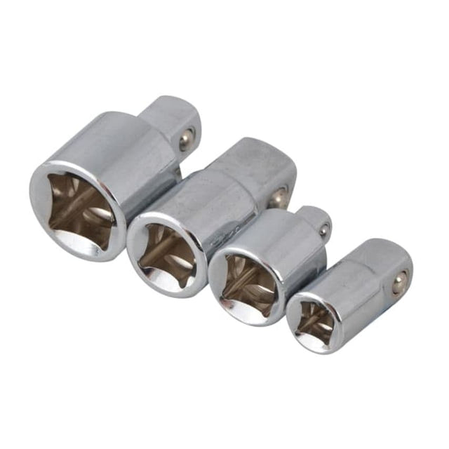 This Blue Spot adaptor set contains 4 adaptors, each manufactured from chrome vanadium, hardened and tempered for durability. They have spring loaded ball bearings to hold sockets securely. The set contains the following adaptors 1/4in Female & gt 3/8in Male 3/8in Female & gt 1/4in Male 1/2in Male & gt 3/8in Female 1/2in Female & gt 3/8in Male