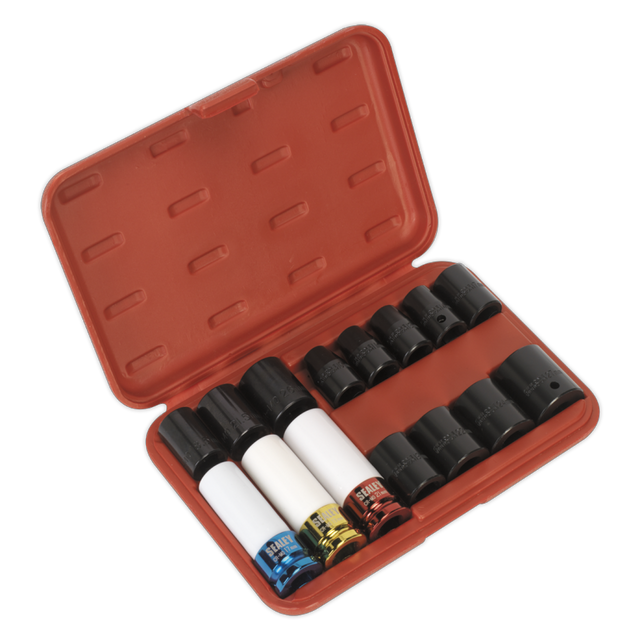 Comprehensive impact socket set. Consists of three Chrome Molybdenum locking wheel nut removal sockets. Three Chrome Molybdenum colour-coded alloy wheel impact sockets with protective sleeve. Nine hardened and tempered Chrome Vanadium steel impact sockets with a phosphate finish for greater corrosion resistance. All impact sockets are WallDrive, which allows a transfer of up to 30% more torque to the fixing. Supplied in storage case.