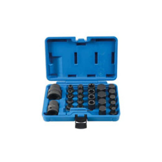 A dual 3/4" & 1" square drive impact socket and bit set, that includes a comprehensive selection of hex, star* and spline profiles. Ideal for use on commercial vehicles. A high quality set designed for the demands of impact driving. Supplied in a robust box (180mm x 270mm) for secure and organised tool storage. An ideal kit for the safe and fast adjustment of a wide range of fixings. 4 Star* impact sockets: E18, E20, E22, E24. Depth: 107mm.Adaptors: 1"D x 22mm Hex x 62mm long; 3/4"D x 22mm Hex x 52mm long; 1 x 2.5mm Hex key for locking the bit into the driver. 9 x Hex impact bits: 14, 17, 19, 21, 22mm (in alloy steel); 24, 27, 30, 32mm (in carbon steel). 3 x Spline impact bits: M16, M18, M20; 5 x Star* impact bits: T60, T70, T80, T90, T100 (in alloy steel).